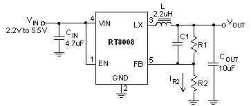 General Description The RT8008 is a high-efficiency pulse-width-modulated (PWM) step-down DC-DC converter. Capable of delivering 600mA output current over a wide input voltage range from 2.5V to 5.5V