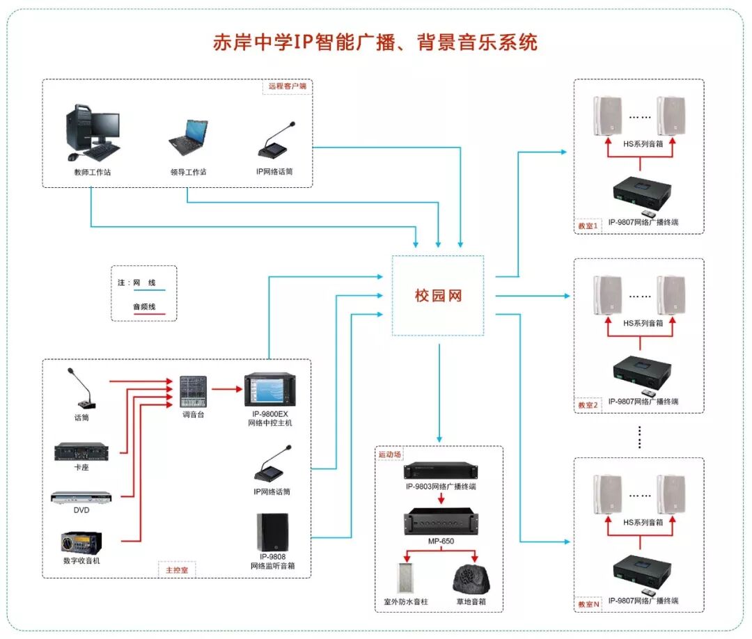 HiVi惠威IP智能广播、背景音乐系统根据校方要求及功能分布,总共分为九大区域,分别为分校区、教学区、运动场地区、活动广场区、宿舍区、用餐区、科研区、实验区、阅览区,完全实现各区域间的互联互通。可系统设定自动运行,无人值守;实现不同区域同时或不同时播放相同或不同的广播内容;实现个性化定时、定点的播放特定内容;各教室可进行音频扩音,教学电脑的音频输出可接入语音终端扩音播出;实现学校原有的各种不同音源节目课件转换成数据文件;实现实时点播互动,老师可在教室内通过遥控或按键方式任意调用服务器中所需的文件和资料进行播放;实现主控室可监听各教室终端播放内容和效果等。完全满足赤岸中学日常工作的需要,达到示范性校园的高标准、高要求,是一套真正完全按照全日制校园量身定制的全智能IP广播、背景音乐系统产品。
