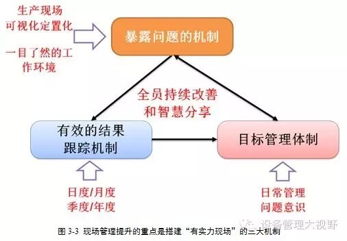 通过管理者关注现场,重视现场,带动企业形成乐于发现问题解决问题的良好机制。在TnPM推进过程中,关于现场管理提升的重点是搭建“有实力现场”的三大机制,如图3-3所示。